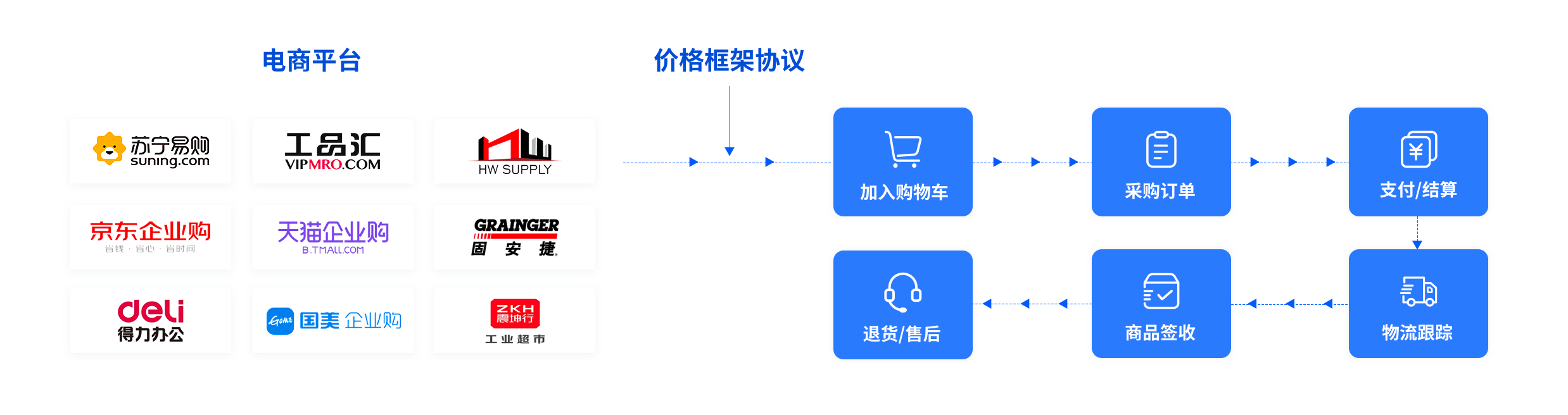 链接主流电商平台,汇聚海量电商资源,通过企业专属采购商城完成办公用品、劳保用品、福利礼赠、MRO服务在内的非生产性物资采购