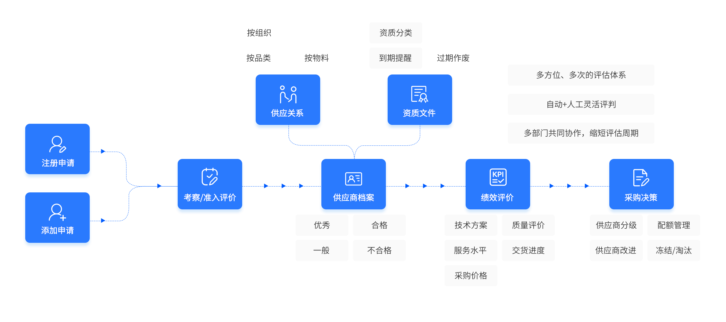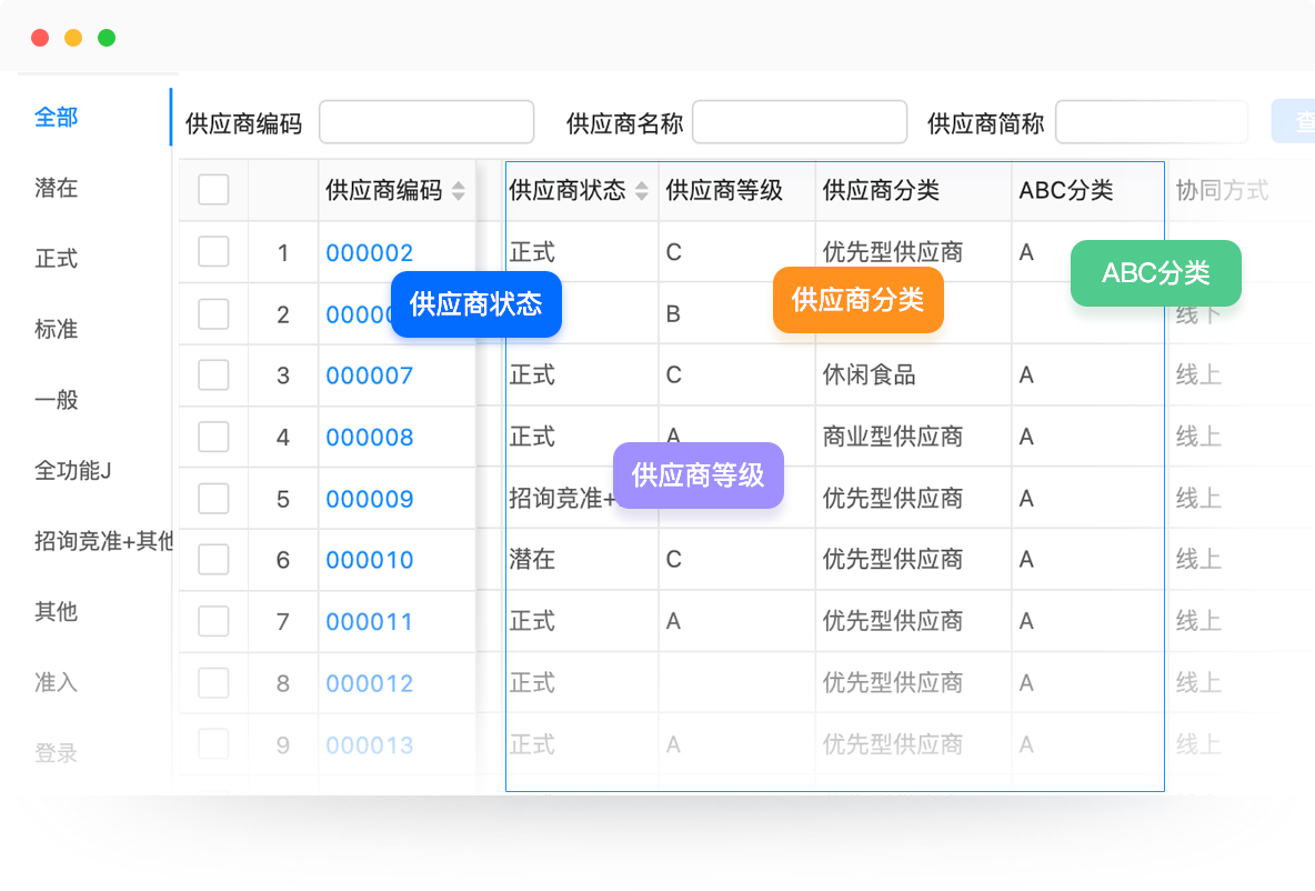 ◆ 支持按组织、品类、物料等维度确定供应商的供应关系、状态、等级