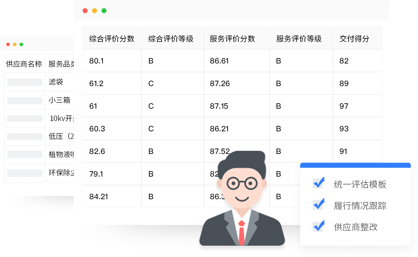 自定义评估模型:支持按质量、价格、交期、服务等维度自定义评估模型,科学评估供应商履约能力