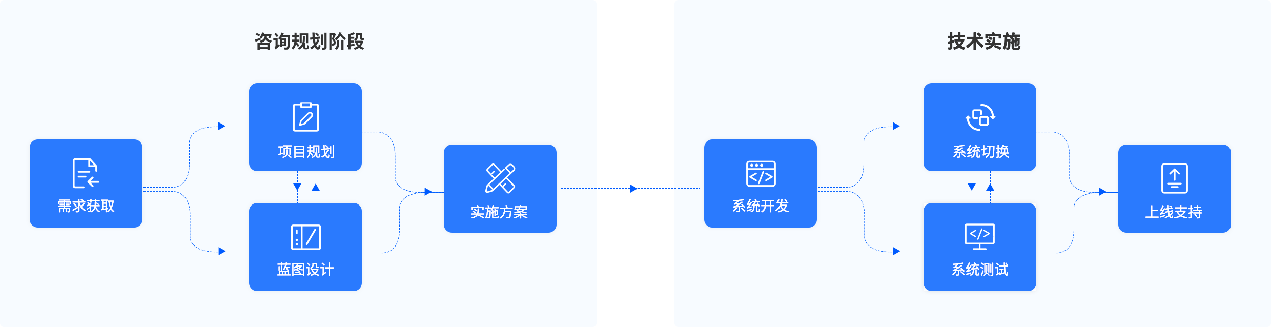 拥有丰富行业经历的售前顾问提供专业的方案分析咨询,专业的实施团队辅助梳理需求与业务场景设计,售后团队负责系统运维、问题响应及持续优化,确保系统稳定运行与价值持续释放,助力客户成功。